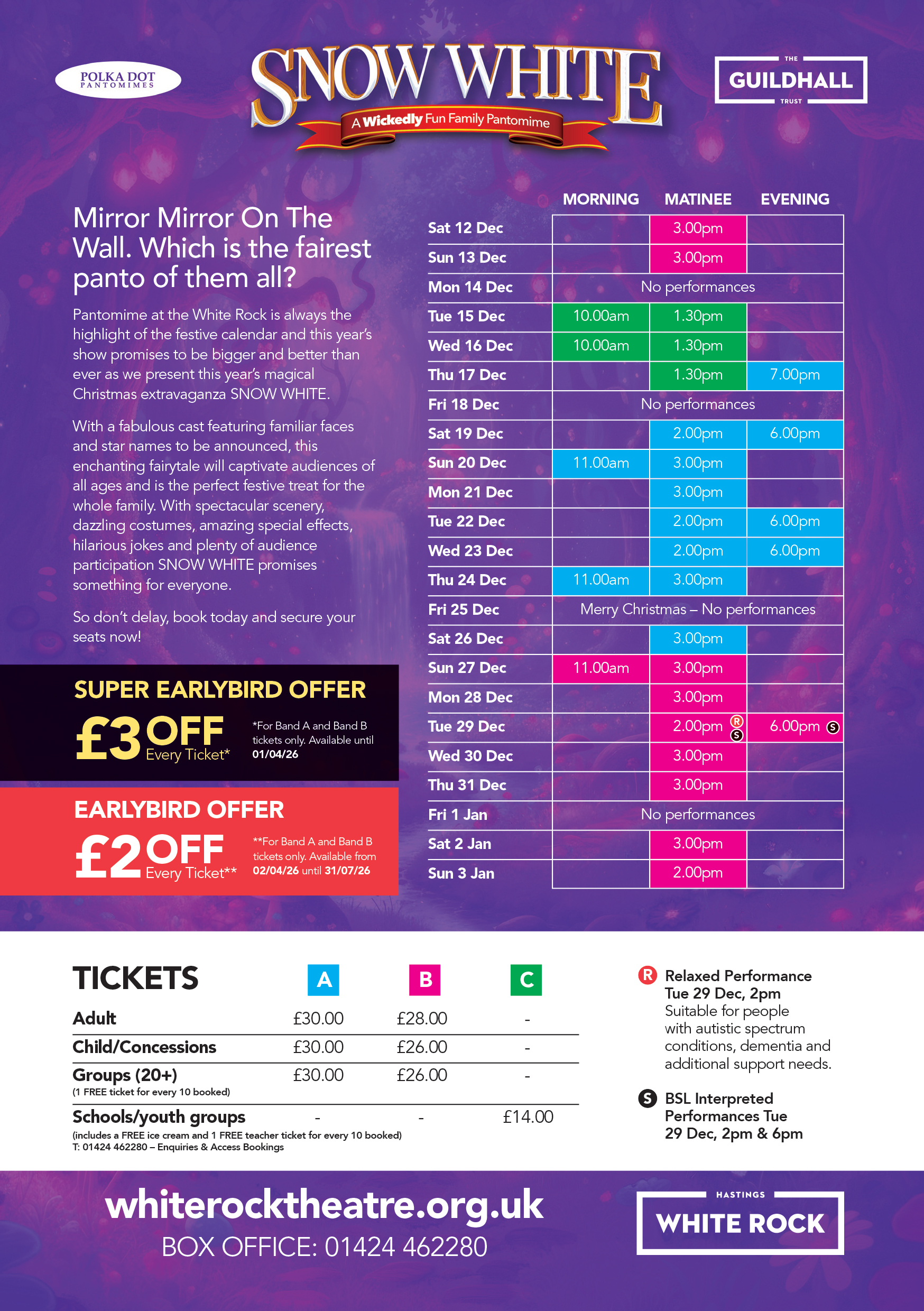Following last year’s amazing pantomime Jack and the Beanstalk Polka Dot Pantomimes and White Rock Theatre, Hastings are proud to present this year’s magical Christmas extravaganza SNOW WHITE.